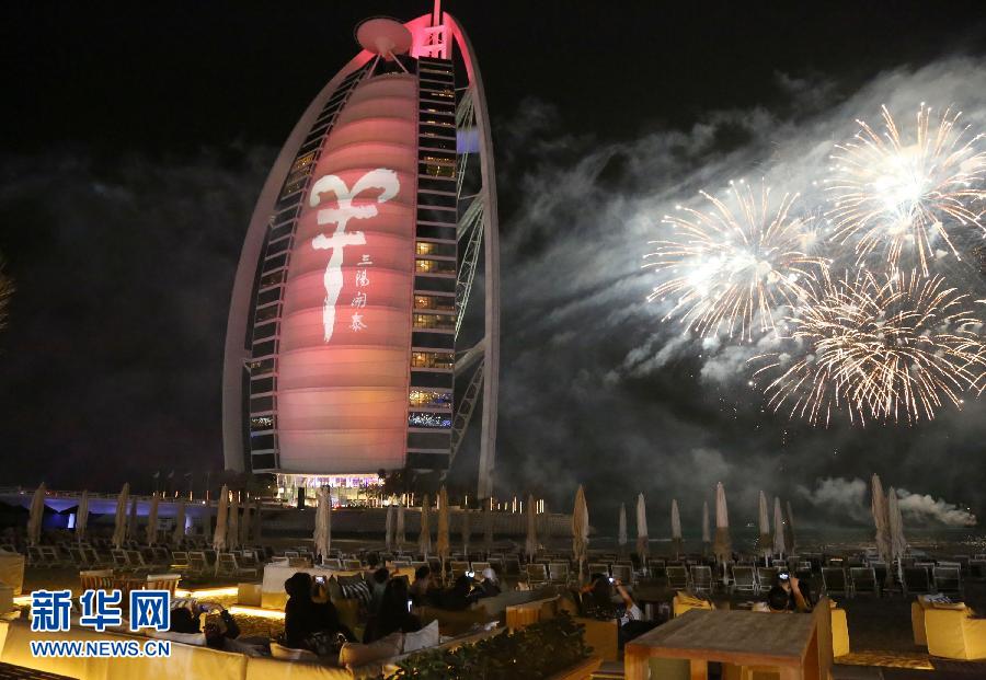 2月19日,阿联酋迪拜地标建筑阿拉伯塔酒店(又称帆船酒店)在楼体正面外墙上打出中文书法“羊”以及“三阳开泰”字样。当日,该酒店连续第四年举办中国农历新年庆典。在2015年春节期间,世界各地举行活动庆祝羊年的到来,海外华侨华人和其他当地民众一起欢度节日,许多外国政要也参与春节活动。招人喜爱的羊型装饰、闪耀夜空的烟火灯饰、传统的舞龙舞狮和红灯笼……喜气洋洋的年味不知不觉洋溢全球。随着中国文化影响力提高,春节已逐渐成为世界性节日文化活动。新华社记者李震摄