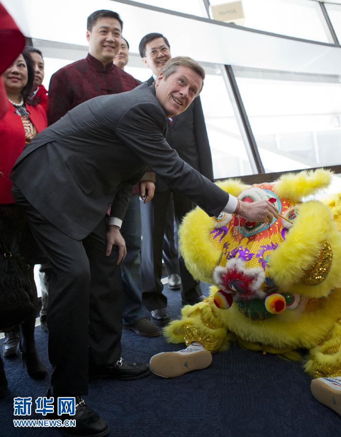 2月20日,在加拿大多伦多市政府举办的新春招待会上,多伦多市长约翰·托里(前)为舞狮点睛。当日,加拿大总理哈珀、加拿大国防部长兼多元文化部长杰森·肯尼、多伦多市长约翰·托里等官员纷纷参加春节庆祝活动,向当地华侨华人与各界代表拜年,共庆新春。在2015年春节期间,世界各地举行活动庆祝羊年的到来,海外华侨华人和其他当地民众一起欢度节日,许多外国政要也参与春节活动。招人喜爱的羊型装饰、闪耀夜空的烟火灯饰、传统的舞龙舞狮和红灯笼……喜气洋洋的年味不知不觉洋溢全球。随着中国文化影响力提高,春节已逐渐成为世界性节日文化活动。新华社发(邹峥摄)