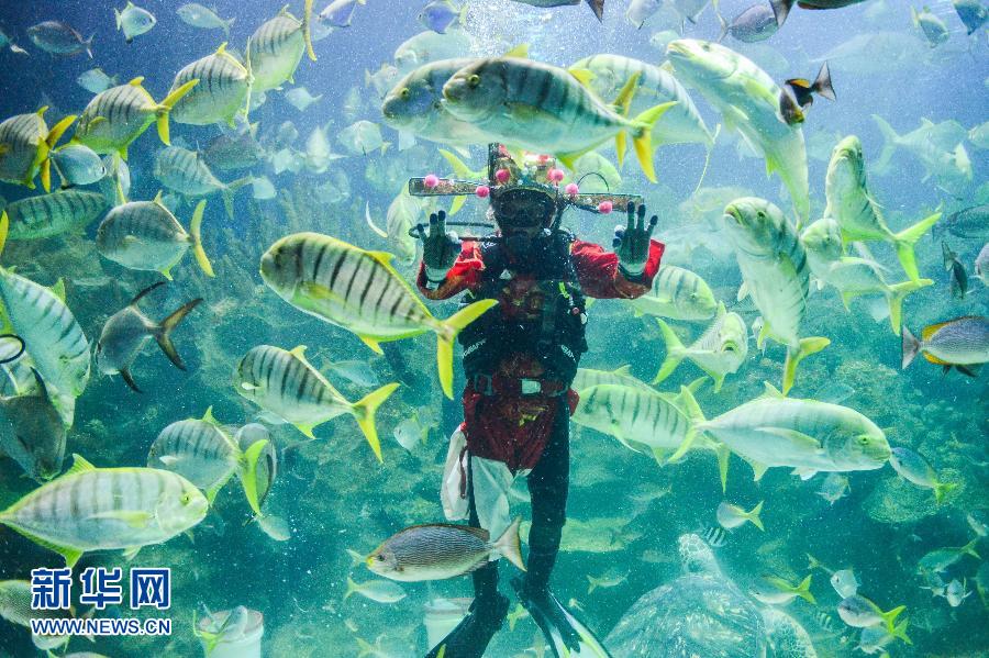 2月16日,在马来西亚吉隆坡水族馆,一名潜水员装扮成“财神”与游客互动,迎接中国农历新年的到来。在2015年春节期间,世界各地举行活动庆祝羊年的到来,海外华侨华人和其他当地民众一起欢度节日,许多外国政要也参与春节活动。招人喜爱的羊型装饰、闪耀夜空的烟火灯饰、传统的舞龙舞狮和红灯笼……喜气洋洋的年味不知不觉洋溢全球。随着中国文化影响力提高,春节已逐渐成为世界性节日文化活动。新华社发(张纹综摄)