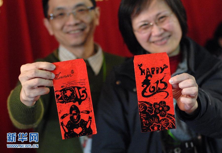 2月20日,在加拿大温哥华,两人在农历新年庆祝活动上展示羊年红包。在2015年春节期间,世界各地举行活动庆祝羊年的到来,海外华侨华人和其他当地民众一起欢度节日,许多外国政要也参与春节活动。招人喜爱的羊型装饰、闪耀夜空的烟火灯饰、传统的舞龙舞狮和红灯笼……喜气洋洋的年味不知不觉洋溢全球。随着中国文化影响力提高,春节已逐渐成为世界性节日文化活动。新华社发(谢尔盖摄)