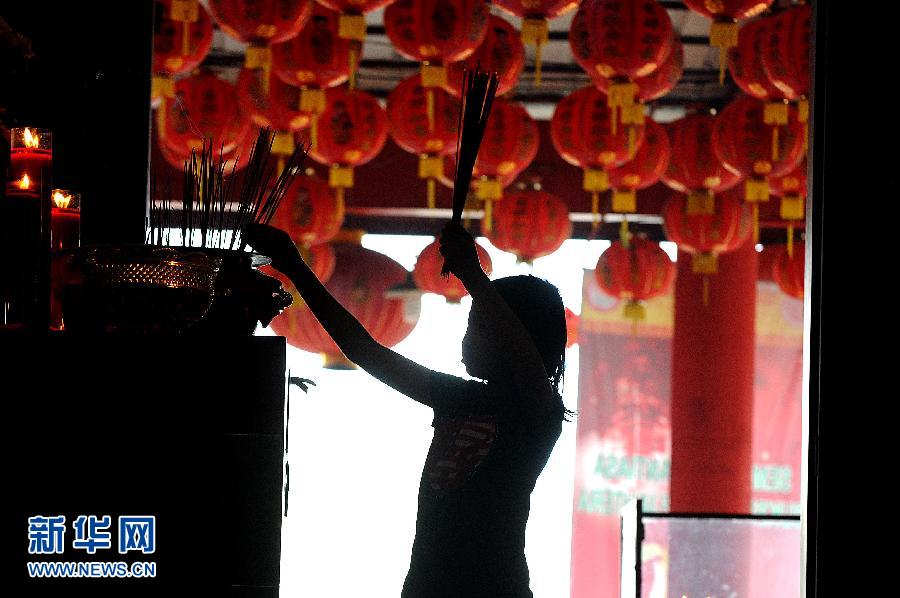 2月19日,在印度尼西亚南唐格朗的一座寺庙,一名女子在新年第一天焚香祈福。在2015年春节期间,世界各地举行活动庆祝羊年的到来,海外华侨华人和其他当地民众一起欢度节日,许多外国政要也参与春节活动。招人喜爱的羊型装饰、闪耀夜空的烟火灯饰、传统的舞龙舞狮和红灯笼……喜气洋洋的年味不知不觉洋溢全球。随着中国文化影响力提高,春节已逐渐成为世界性节日文化活动。新华社发(阿贡摄)