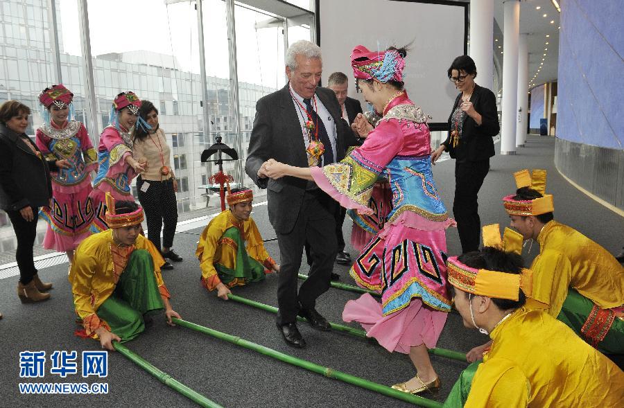 2月17日,在比利时首都布鲁塞尔欧洲议会,来自广西南宁歌舞团的演员与欧洲议会议员及工作人员一起跳民族舞。在2015年春节期间,世界各地举行活动庆祝羊年的到来,海外华侨华人和其他当地民众一起欢度节日,许多外国政要也参与春节活动。招人喜爱的羊型装饰、闪耀夜空的烟火灯饰、传统的舞龙舞狮和红灯笼……喜气洋洋的年味不知不觉洋溢全球。随着中国文化影响力提高,春节已逐渐成为世界性节日文化活动。新华社记者叶平凡摄