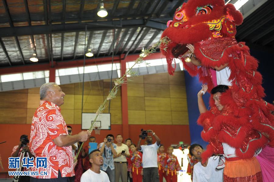 2月22日,在斐济首都苏瓦,斐济总理姆拜尼马拉马在华侨华人春节团拜会上参与舞狮采青环节。