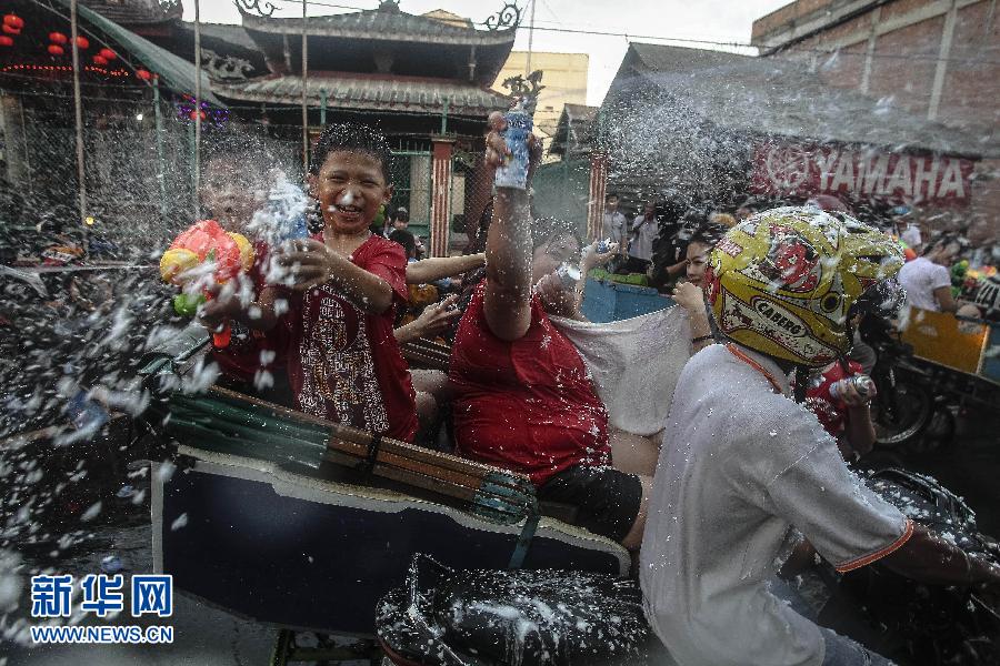 2月20日,在印度尼西亚廖内省默兰蒂岛,人们互相泼水庆祝春节。在2015年春节期间,世界各地举行活动庆祝羊年的到来,海外华侨华人和其他当地民众一起欢度节日,许多外国政要也参与春节活动。招人喜爱的羊型装饰、闪耀夜空的烟火灯饰、传统的舞龙舞狮和红灯笼……喜气洋洋的年味不知不觉洋溢全球。随着中国文化影响力提高,春节已逐渐成为世界性节日文化活动。新华社发(坦托·H摄)