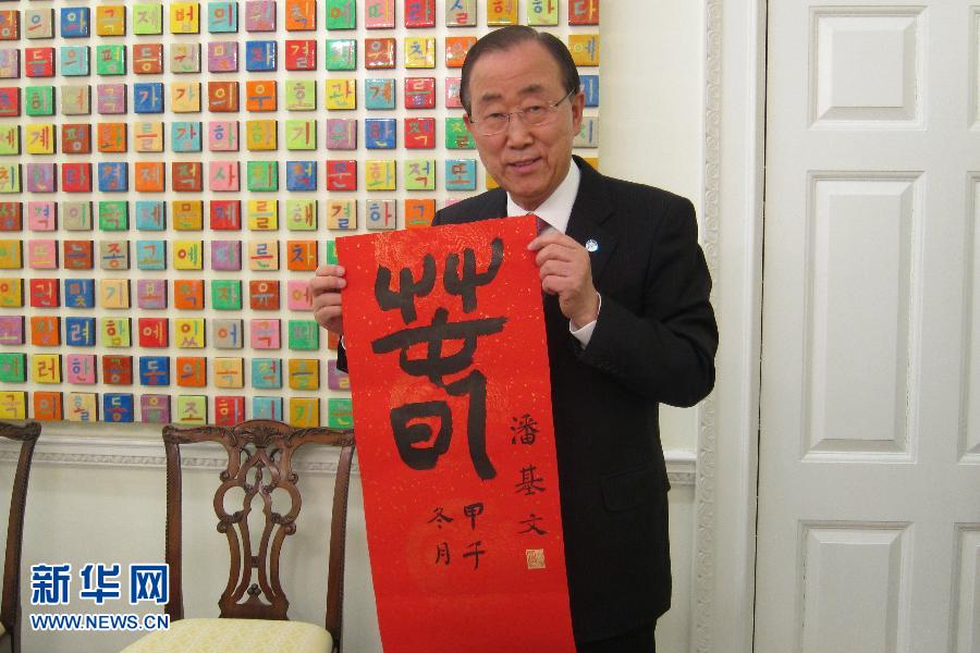 2月13日,在纽约联合国秘书长官邸,联合国秘书长潘基文展示书写的“春”字。应中国文化部邀请,联合国秘书长潘基文13日在纽约官邸为“欢乐春节”全球活动题写了一个“春”字。在2015年春节期间,世界各地举行活动庆祝羊年的到来,海外华侨华人和其他当地民众一起欢度节日,许多外国政要也参与春节活动。招人喜爱的羊型装饰、闪耀夜空的烟火灯饰、传统的舞龙舞狮和红灯笼……喜气洋洋的年味不知不觉洋溢全球。随着中国文化影响力提高,春节已逐渐成为世界性节日文化活动。新华社发(张俊摄)