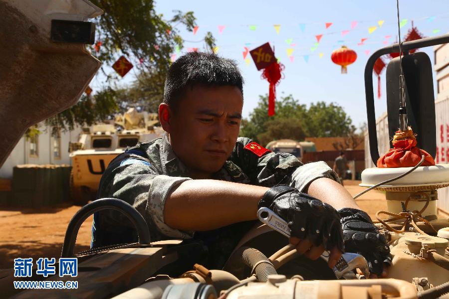 2月19日,在马里北部城市加奥,中国第二批赴马里维和警卫分队队员徐强在巡逻前检修车辆。徐强已经连续6年在执勤岗位上度过春节。在2015年春节期间,世界各地举行活动庆祝羊年的到来,海外华侨华人和其他当地民众一起欢度节日,许多外国政要也参与春节活动。招人喜爱的羊型装饰、闪耀夜空的烟火灯饰、传统的舞龙舞狮和红灯笼……喜气洋洋的年味不知不觉洋溢全球。随着中国文化影响力提高,春节已逐渐成为世界性节日文化活动。新华社发(范存印摄)