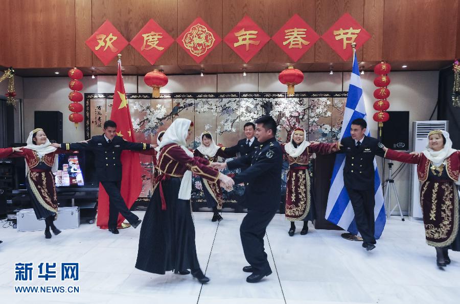 2月18日,在希腊首都雅典,中国海军官兵在晚会上跳舞。当天是中国农历的除夕,也是中国海军第十八批护航编队访问希腊的第三天。当天晚上,中国驻希腊大使馆邀请编队官兵代表来到使馆,与使馆工作人员及中资机构、华人华侨和留学生代表举行联欢晚会,共庆羊年春节。在2015年春节期间,世界各地举行活动庆祝羊年的到来,海外华侨华人和其他当地民众一起欢度节日,许多外国政要也参与春节活动。招人喜爱的羊型装饰、闪耀夜空的烟火灯饰、传统的舞龙舞狮和红灯笼……喜气洋洋的年味不知不觉洋溢全球。随着中国文化影响力提高,春节已逐渐成为世界性节日文化活动。新华社记者刘咏秋摄