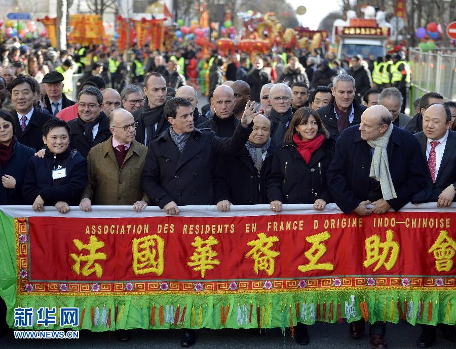 2月22日,在法国巴黎,法国总理瓦尔斯(前排中间挥手者)、法国内政部长卡泽纳夫(前排左三)、巴黎市长伊达尔戈(前排右三)参加庆祝春节的大游行。在2015年春节期间,世界各地举行活动庆祝羊年的到来,海外华侨华人和其他当地民众一起欢度节日,许多外国政要也参与春节活动。招人喜爱的羊型装饰、闪耀夜空的烟火灯饰、传统的舞龙舞狮和红灯笼……喜气洋洋的年味不知不觉洋溢全球。随着中国文化影响力提高,春节已逐渐成为世界性节日文化活动。新华社/法新