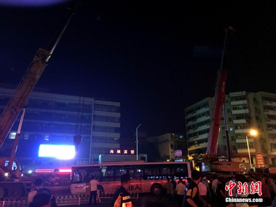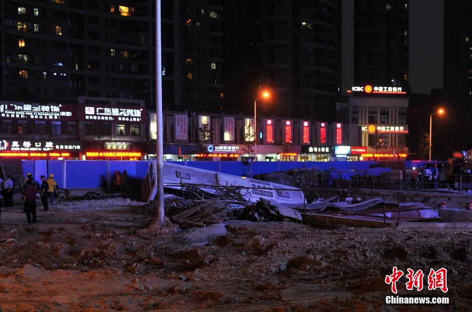 5月20日晚20时30分许,江西南昌冲进地铁施工现场的公交车被大型吊机吊起并运离事故现场。当天下午17时20分左右,南昌市一辆乘坐5人的单位公交特约车,因避让不及冲进正在施工的地铁围档内,事故造成乘客3人、地铁施工人员2人受伤。 中新社发 雷文龙 摄