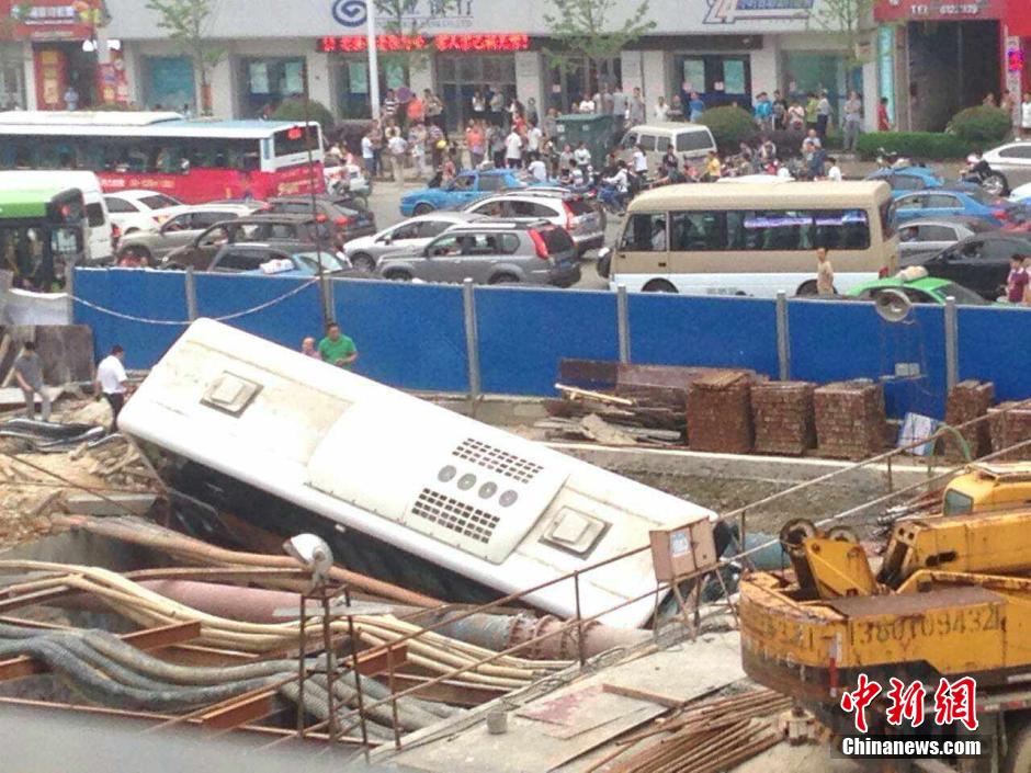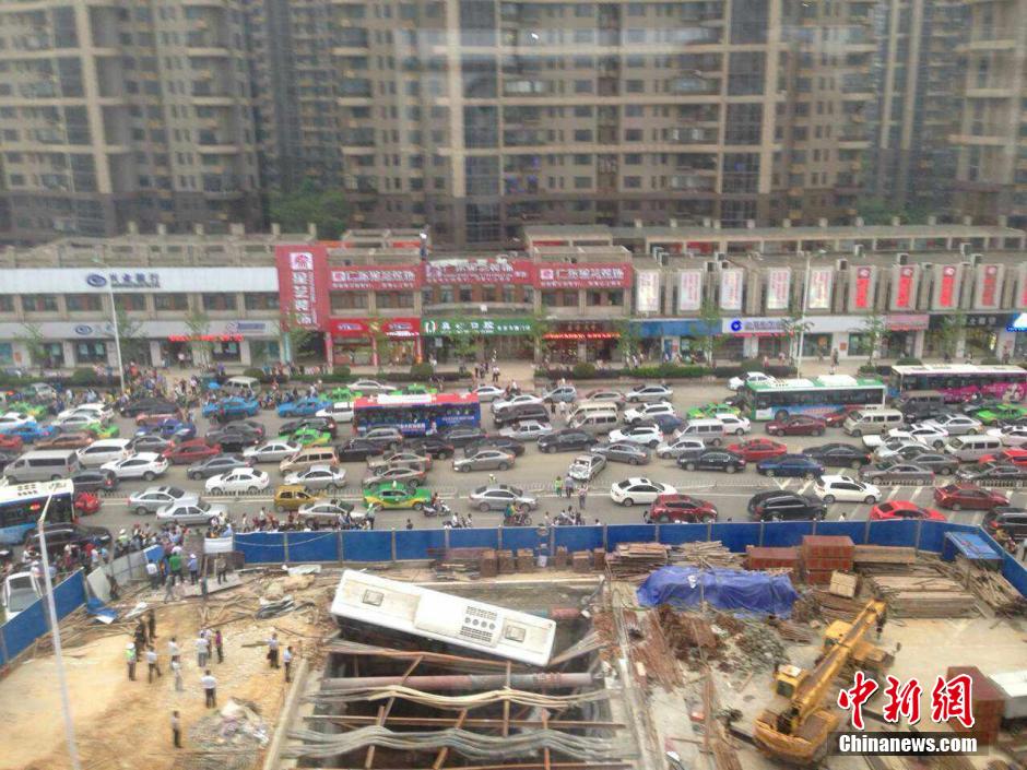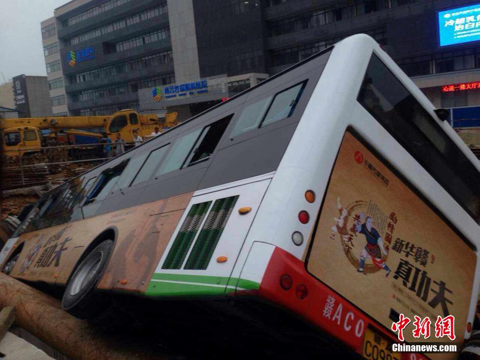 5月20日下午17时20分左右,江西南昌市北京东路的江大南路口(恒茂梦时代广场附近)一辆大巴车冲进正在施工的地铁围档内,并掉入坑中。目前事故造成该路段通行缓慢,相关部门和人员也已赶到现场展开救援。刘占昆 摄