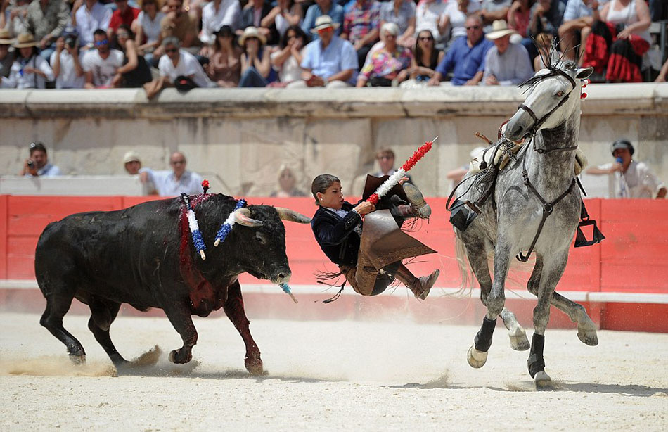尼姆斗牛节共举行五天,每个斗牛士每天需要进行两场斗牛表演。斗牛表演结束后,狂欢者们会聚集在酒吧或夜总会中,喝酒庆祝这一饱受争议的传统活动。(沈姝华)