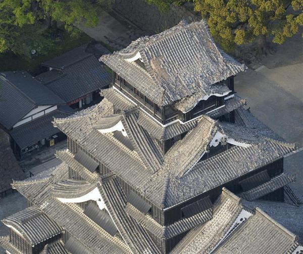 里氏6.5级的强震导致熊本城天守阁的瓦片纷纷从屋顶摔落,而且城墙底座出现崩塌。