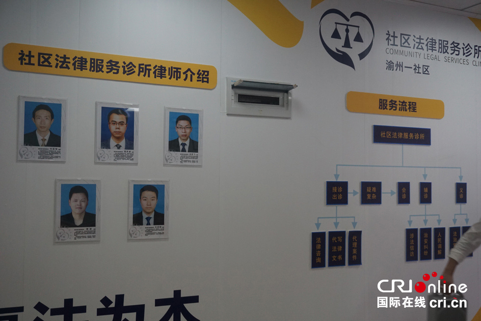 一进诊所的大门,记者看到两名工作人员在“坐诊”,柜台上摆放着各种法律介绍文件,墙上贴着工作流程、律师介绍等内容。据负责人介绍,他们不仅在诊所“坐诊”,还在居民不方便的时候上门“出诊”。