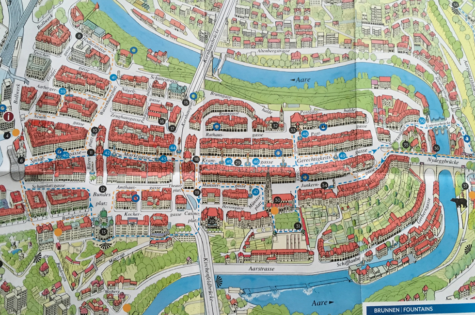 伯尔尼在1405年遭遇了一场大火,这座中世纪城镇的主体建筑在18世纪重新修建,并保留了原来的历史风貌。世界遗产委员会这样评价说:伯尔尼老城几百年来不断发展进步,但城市的规划理念却始终如一。位于瑞士西部高原中央山地的伯尔尼座落在莱茵河支流阿勒河的一个天然弯曲处,河水从三面环绕伯尔尼老城而过,形成了一个半岛。阿勒河把该城分为老城和新城。从火车站起到熊苑之间的区域便是伯尔尼老城的精华所在。虽然伯尔尼有着非常发达的以公共汽车和有轨电车为主的公共交通网络,但老城更适合徒步游览。伯尔尼处于瑞士德语区,而且瑞士德语也不同于标准德语。不论是看街头的路牌标识,还是手机输入导航,对于不懂瑞士德语的外国人而言,认路需要花一些功夫。不过,明白“gasse”(街道)、“platz”(广场)、“brücke”(桥)这几个词的意思足矣,或者到火车站内的旅游局拿一份包括中文的多语种注释的地图。