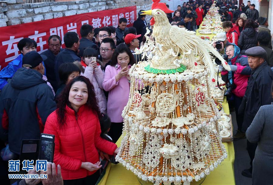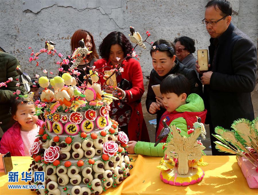 3月16日,人们用手机拍摄面塑作品。当日是农历二月十九,山西省岚县举行传统的岚城供会暨第十一届民间面塑艺术节,人们将精心制作的各式面塑摆上街头供奉祭祀。岚县面塑造型独特,制作精美,2014年被列为国家级非物质文化遗产。新华社发(杨晓勇 摄)