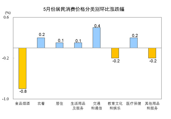 5月份,全国居民消费价格环比下降0.2%。其中,城市下降0.2%,农村下降0.1%;食品价格下降1.3%,非食品价格上涨0.1%;消费品价格下降0.2%,服务价格下降0.1%。