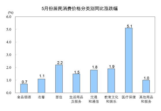 其他七大类价格同比均上涨。其中,医疗保健、居住、教育文化和娱乐价格分别上涨5.1%、2.2%和1.9%,交通和通信、生活用品及服务价格分别上涨1.8%和1.5%,衣着、其他用品和服务价格分别上涨1.1%和1.0%。
