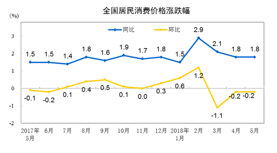 2018年5月份,全国居民消费价格同比上涨1.8%。其中,城市上涨1.8%,农村上涨1.7%;食品价格上涨0.1%,非食品价格上涨2.2%;消费品价格上涨1.3%,服务价格上涨2.5%。1-5月平均,全国居民消费价格比去年同期上涨2.0%。