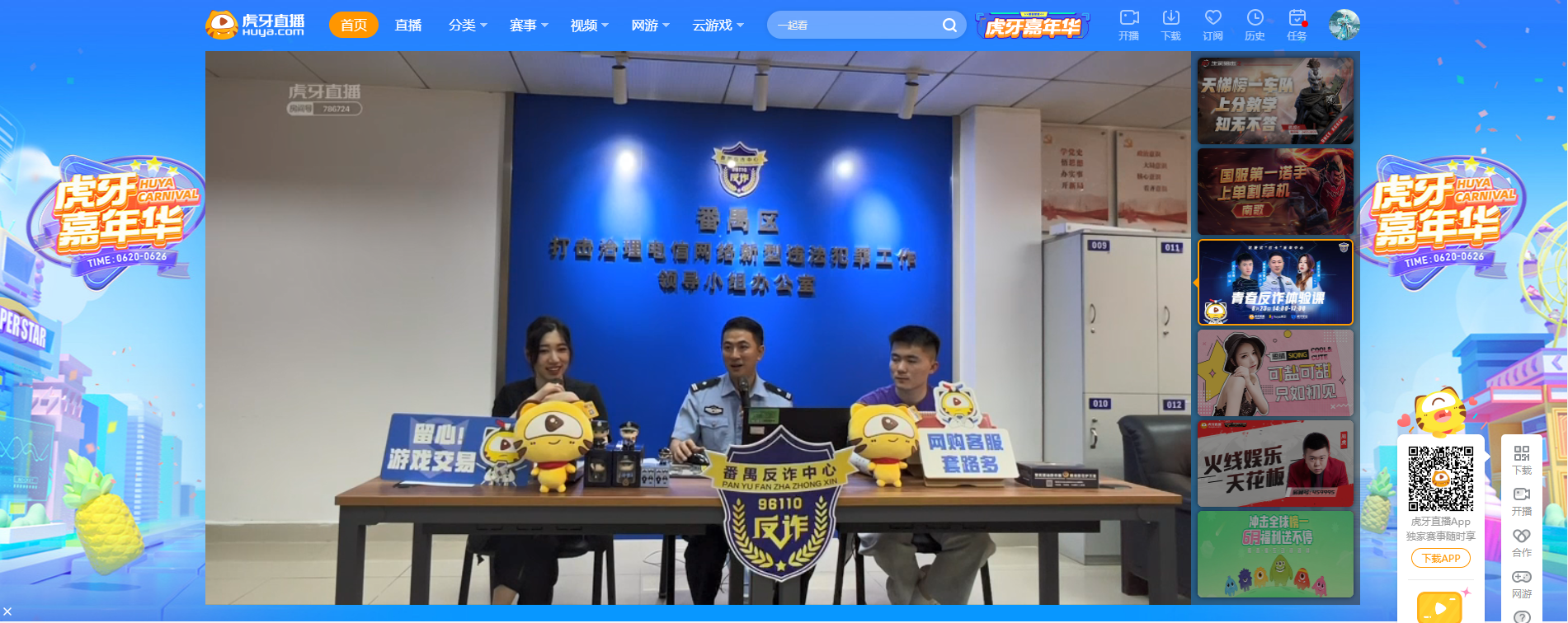 在系列宣传活动中,虎牙公司邀请反诈警官、安全专家等嘉宾,分享交友诈骗、投资诈骗、网络贷款诈骗、冒充电商客服诈骗、游戏装备交易诈骗、游戏代打诈骗等知识。虎牙公司还邀请了平台头部主播体验真实反诈工作,向反诈民警学习如何拨打反诈电话劝阻被诈骗人,跟随反诈民警出警“踢爆”骗局等。