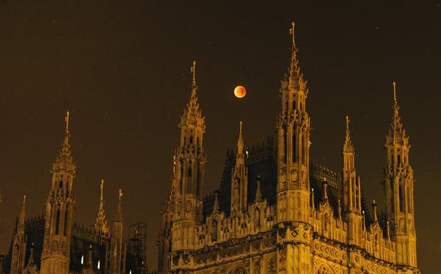 主持人在英国伦敦,超级血月亮升起在议会大厦的尖顶上
